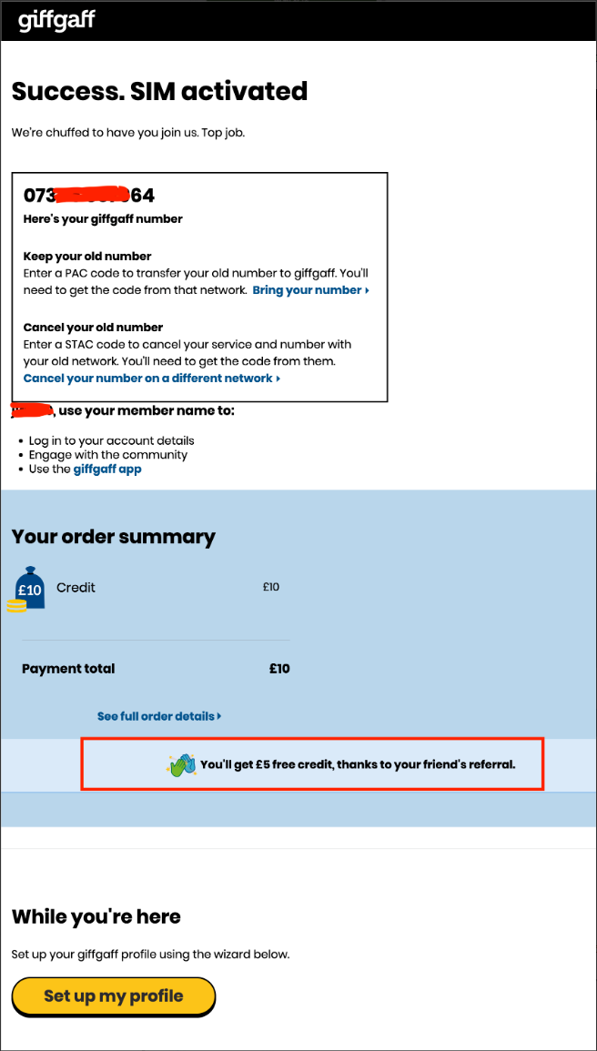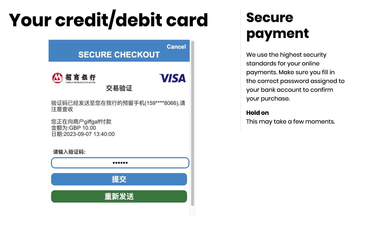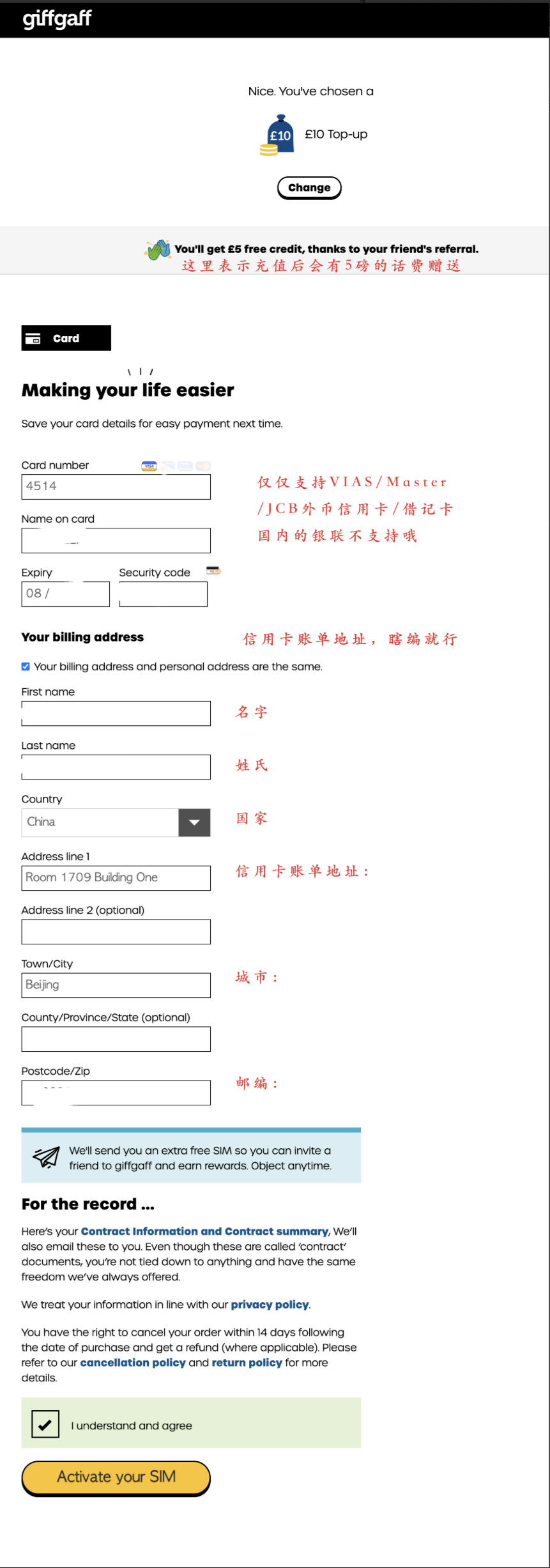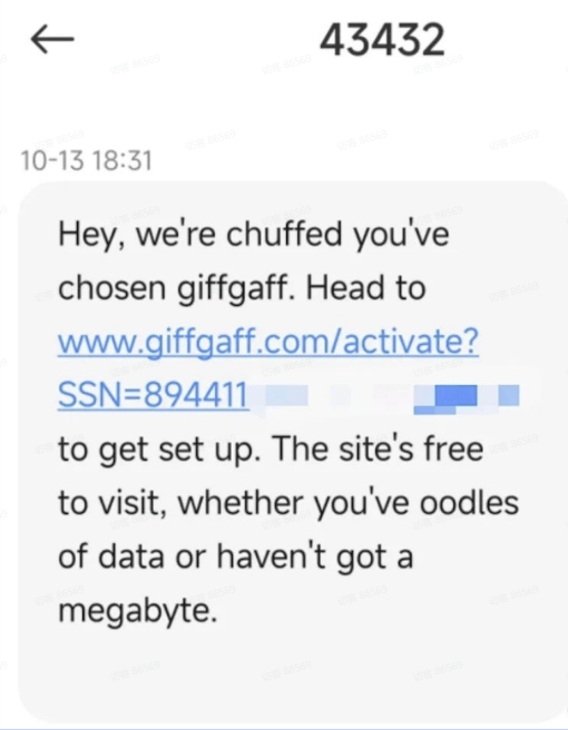 giffgaff手机卡的使用方式和国内手机卡有诸多不同,为了帮助大家快速入门及使用giffgaff,本文将带您了解以下 内容: 漫游资费 激活流程 注意事项 常见功能  20p表示20便士,一便士=0.01英镑,20便士=0.2英镑 1.漫游上网=每兆0.2磅(纯净GBIP,就是挺贵的,不需要的时候请一定==关闭手机上的数据漫游开关!)== 2.拨打电话及语音信箱=每分钟1磅 3.接听电话=每分钟1磅 4.发短信=每条0.3磅 5. ==接收短信免费!== ##### giffgaff没有针对中国的漫游套餐,切记!切记! #### 激活流程 --- #### 准备工作 * ·国内可以直接访问giffgaff官网,如果遇到访问速度很慢,亦可以开启梯子。 * ·准备一部手机,giffgaff不支持中国电信的CDMA制式,极少数电信定制机可能无法使用。 * ·首次充值请务必使用带有芯片的visa维萨、Master万事达的实体卡(==如下图==),信用卡或借记卡都可以。其他例如日本JCB,美国运通AE,中国银联(包括银联+VISA,银联+Master)的任何卡均不支持。另外,境外某些所 谓的虚拟支付卡可能会通过验证并充值成功,但很快会被风控锁卡,并取消充值进去的话费,”得不偿失! > ==温馨提示:如果您使用外币借记卡,请提前兑换12英镑,否则会扣款失败,实际扣款还是10英镑==   --- ### 方法一:网页激活 一、不用插卡,先打开[https://www.giffgaff.com/activate](https://www.giffgaff.com/activate) ,并输入SIM卡正面的6位激活码或背面13位激活码进行 激活。  二、针对主要在国内用来注册接码保号的用户来说,选择0月租的无最低消费套餐即可,将页面拉至最下方,选择 Other potions里的**Pay as you go/No montyly plan** 后,点击**黄色按钮/Continue**,进入下一步充值环节。  三、首次充值激活需要至少10英镑,仅支持使用VISA/MasterCard的实体卡,包括借记卡或信用卡,国内银行也 有发行,具体可以查询当地银行。giffgaff并不支持虚拟信用卡,哪怕一开始充值激活成功,获得号码,后续也会被 风控扣掉话费,切记!切记!切记!如没有合适银行卡,可以联系本店客服代充,QQ客服:==3831553940== 微信客服:==GFGFSIM== TG客服:[@GFGFSIM](https://t.me/GFGFSIM) > ==#提醒:外币借记卡需要提前充值多一点,比如12英镑,才能顺利扣款10英镑==  四、使用银行卡充值时候,请参考下图红色字体输入您的个人信息。如果没有看到5磅的话费赠送字样,说明您的 卡不具备充值送话费的福利,本店卡一律都有这个福利哦。提醒一下,账单地址的国家可以选China,这样不会强 制验证英国地址。  ==另外,部分银行付款时需要进行3DS验证,加载较慢需要耐心等待。==  五、付款成功后,页面上将出现giffgaff分配给您的电话号码。如页面中出现与图示红框内容相同的文字提示,则 会收到赠送的5英镑余额。至此,您已完成了整个激活流程。  六、插卡开机,一般1-15分钟内就会收到两条短信,第一条短信内含运营商自动分配给您的手机号,第二条是针对 国内用户的漫游收费标准提醒。  --- ### 方法二:手机激活 一、将SIM卡插入手机,入网后稍等片刻,会收到一条来自43432的短信,点击短信中的链接进入激活页面。  二、点击短信中的链接进入手机浏览器的激活页面,先输入您的个人邮箱,后续跟着页面指示一步步操作即可,和 网页端类似。  ### 注意事项 --- 一、如何避免额外扣费: 1.发送短信、通话、上网,资费见文章置顶。 2.不要手动拒接任何来电,由于giffgaff默认开通了语音信箱功能,拒接来电后将会自动接入语音信箱产生费 用,请在拨号界面输入 ##002#,按下拨号键,即可关闭语音信箱功能。 3.激活FaceTime与iMessage 服务,如不需要iOS 提供的FaceTime与iMessage服务,请在系统弹出以下对 话框时点击取消按钮,否则算为发送一条短信,扣费0.3磅。  二、激活后的号卡需要每180天内进行一次消费或充值,以进行保号,若长时间话费余额没有变化,会收到下图所 示的警告邮件,请按邮件提示进行操作,不予理会将被销号,关于保号的具体内容,可以[点击这里]()了解更多  三、首次充值请务必使用带有芯片的visa维萨、Master万事达的实体卡(如下图),信用卡或借记卡都可以。其他 例如日本JCB,美国运通AE,中国银联的任何卡均不支持。另外,境外某些所谓的虚拟支付卡可能会通过验证并充 值成功,但很快会被风控锁卡,并取消充值进去的话费,得不偿失!